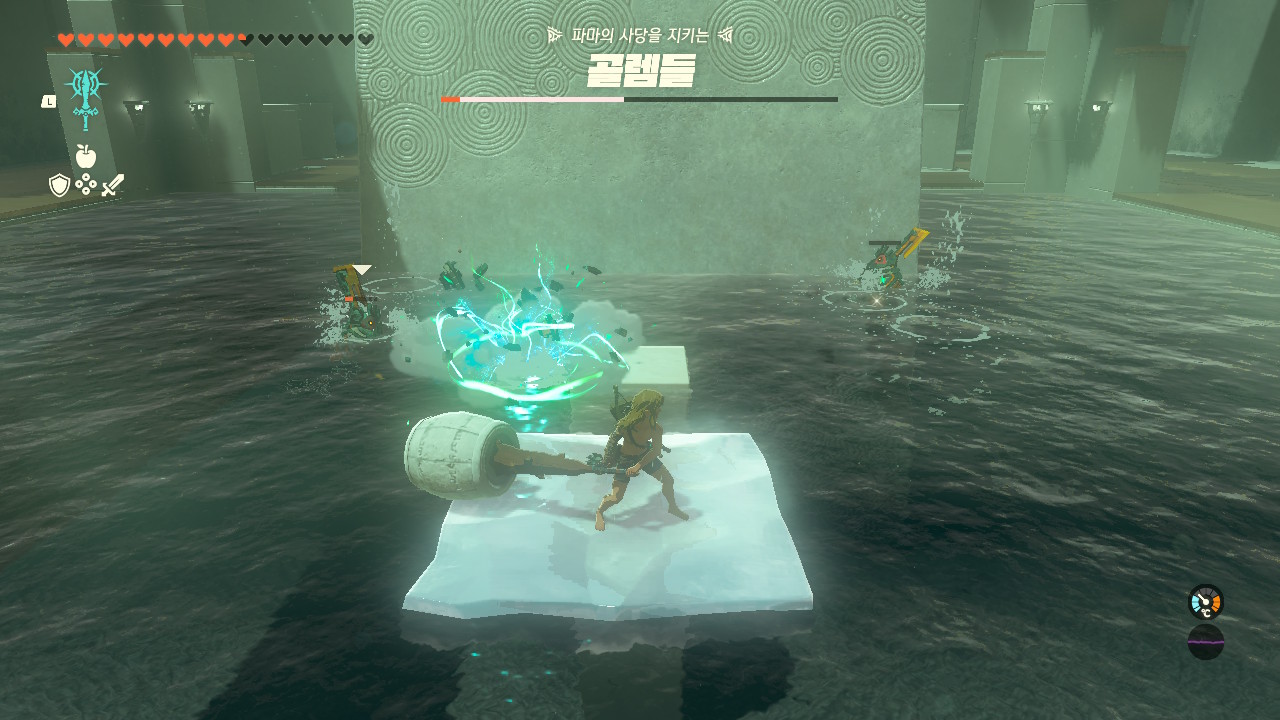 얼음판을 딛고 올라가 스크래빌드한 무기로 기둥을 부셔주시면 골렘이 물에 빠져죽습니다.