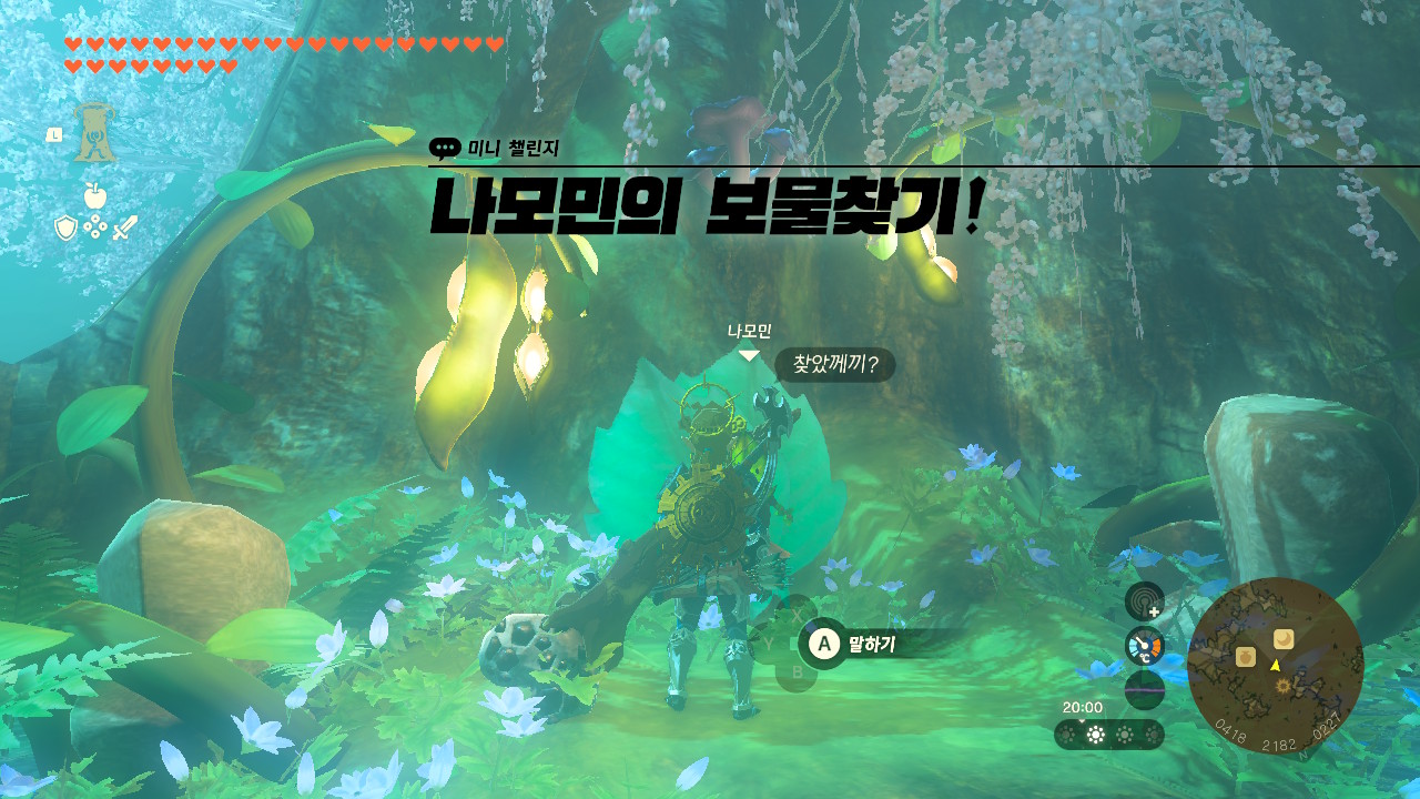 코르그 숲 데크나무 꼭대기에 있는 나모민에게 말을 걸어 미니 챌린지를 받아주세요.