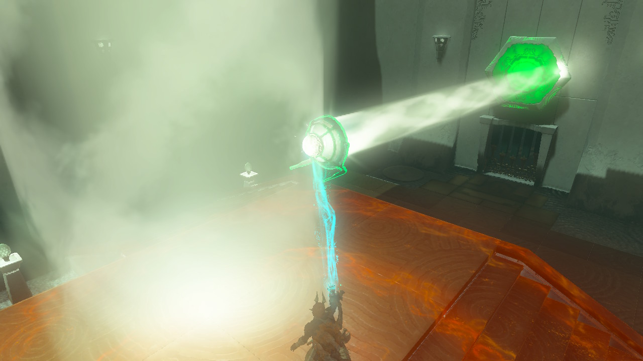 거울을 울트라핸드로 들어 중앙에서 나오는 빛을 장치로 반사시켜주세요. 게이지가 전부차서 초록색으로 변하면 문이 열립니다.