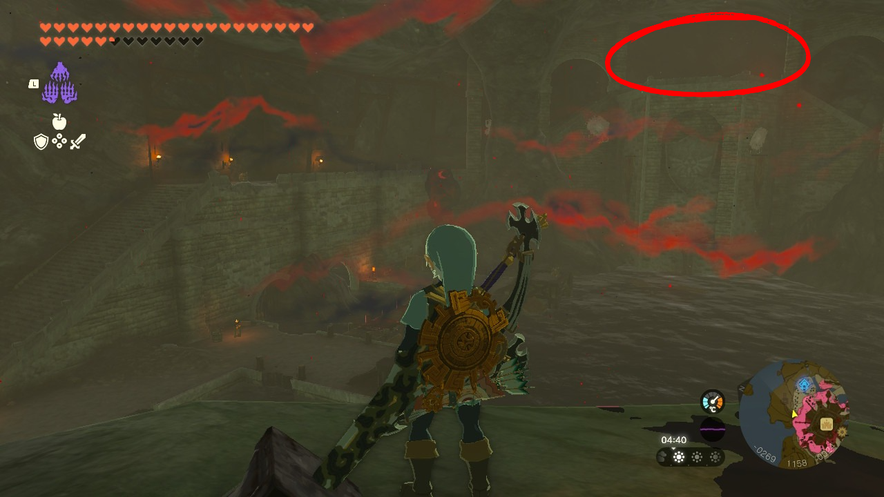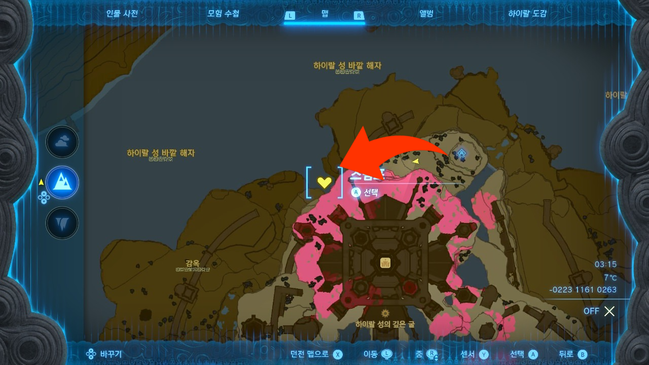 동그라미로 표시한 위치에 제단이 있습니다. 해당 위치로 이동해주세요.가는 길에 팬텀 가논이 있으니, 싸우고 싶지 않으신 분들은 패러세일을 이용해 날아가시는 걸 권장드립니다.