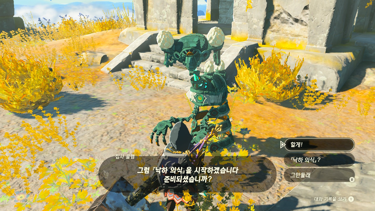 사당 바깥에 있는 골렘에게 말을 걸면 낙하 의식을 치룰 수 있습니다.