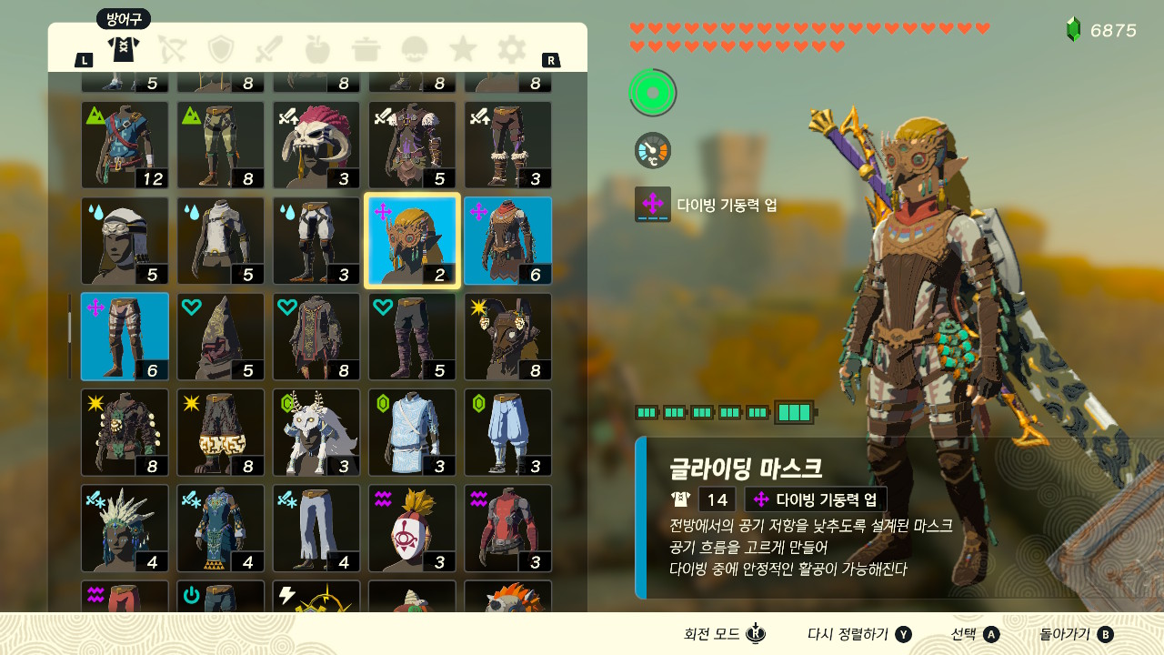 글라이딩 세트를 전부 모으면 다이빙 기동력 업이라는 세트효과가 생겨, 공중에서 이동이 편리해집니다.