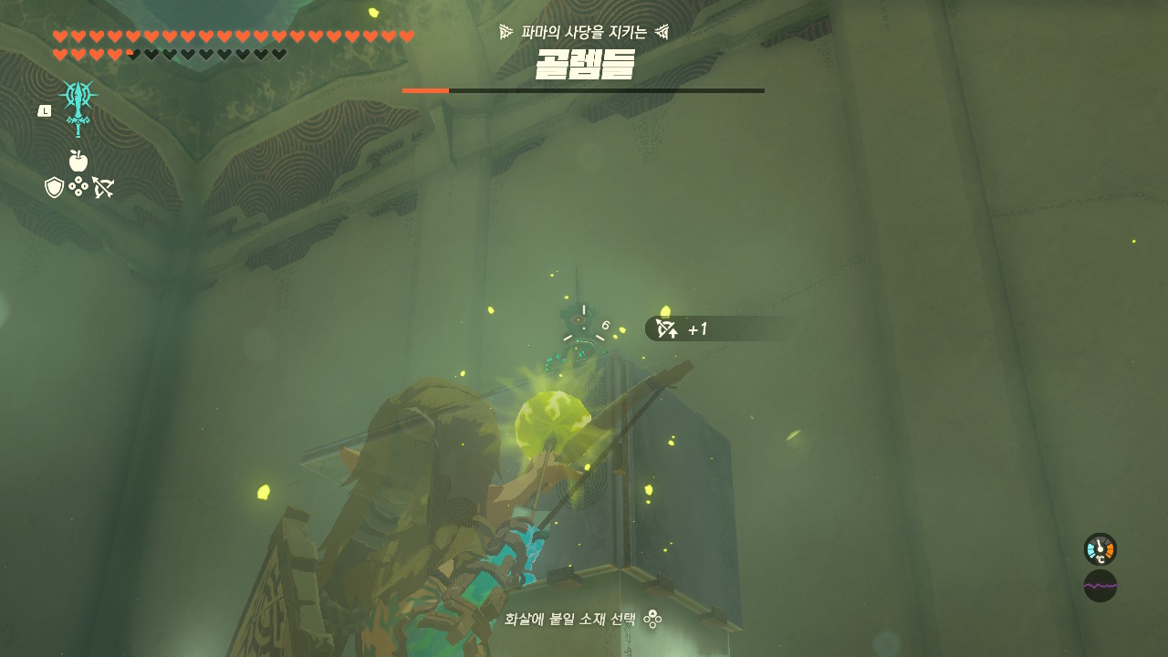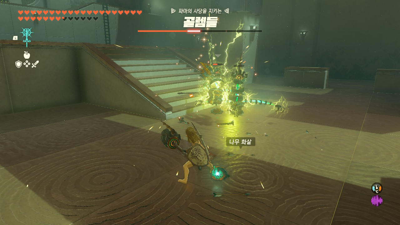 양 옆으로 저격수 골렘 두 마리가 있습니다. 필드에 있는 전기의 열매를 활에 붙여 쏴주세요.