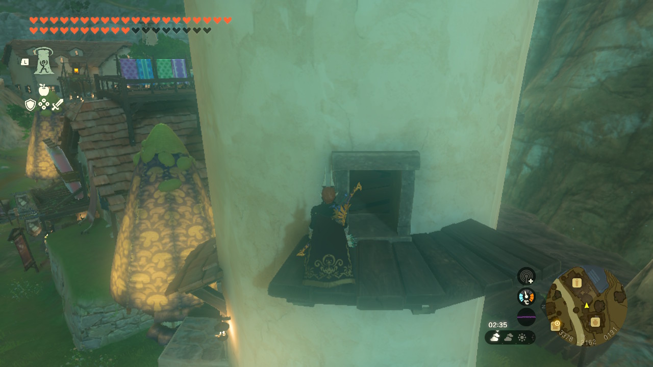 사고노가 들어간 건물 옆면을 둘러보시면 트레루프를 사용할 수 있는 발판이 하나 있습니다. 그 위로 트레루프 해주신 후 몸을 수그려 개구멍 안으로 들어가주세요.
