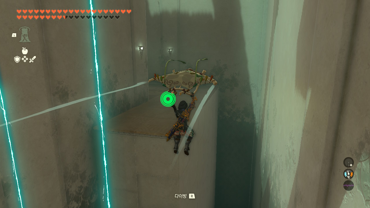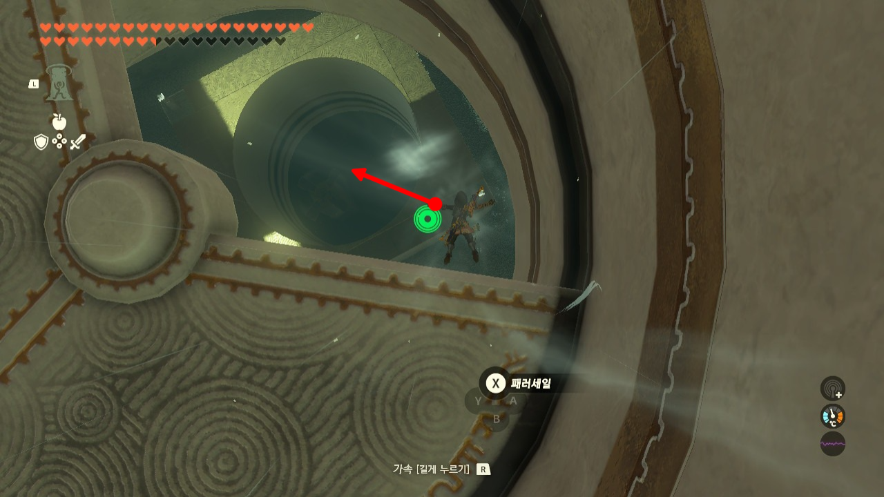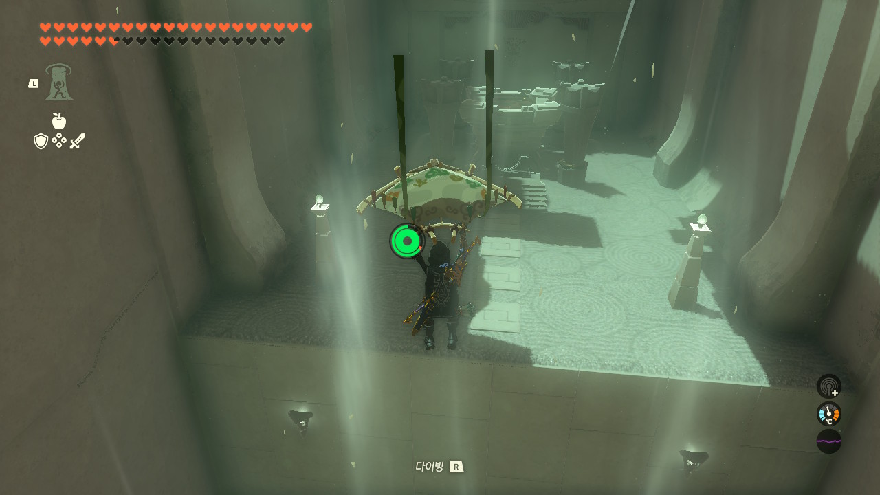 패러세일을 탄 상태에서는 상승기류를 때문에 내려갈 수가 없으니 패러세일을 해제하시고, R을 눌러 가속해 빠르게 통과해주세요. 그 다음 패러세일을 접었다 폈다를 사용하여 바닥에 안전하게 착지합니다.