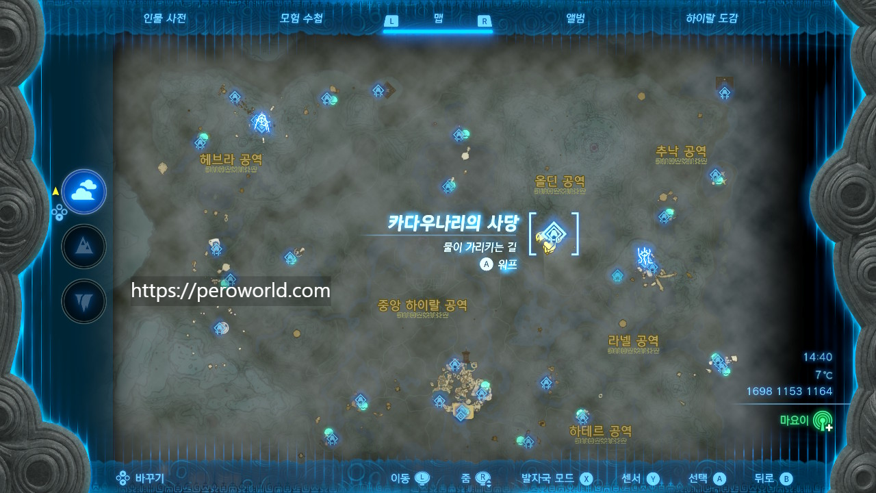젤다의 전설 왕국의 눈물 카다우나리의 사당 (물이 가리키는 길) 위치 : 올딘 협곡 상공 (1882 1203 1265) 올딘 협곡 상공에 위치한 사당입니다. 올딘 협곡 조망대를 이용하시면 쉽게 오실 수 있습니