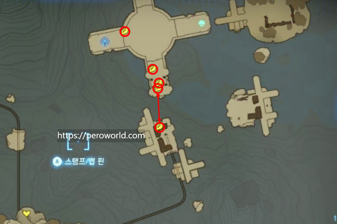 카다우나리의 사당으로 워프했다는 가정하에 진행하겠습니다. 사당이 위치한 첫 번째 섬에서 해품이꽃 4개를 획득주시고, 화살표로 표시한 다음 구역으로 날아가주세요.