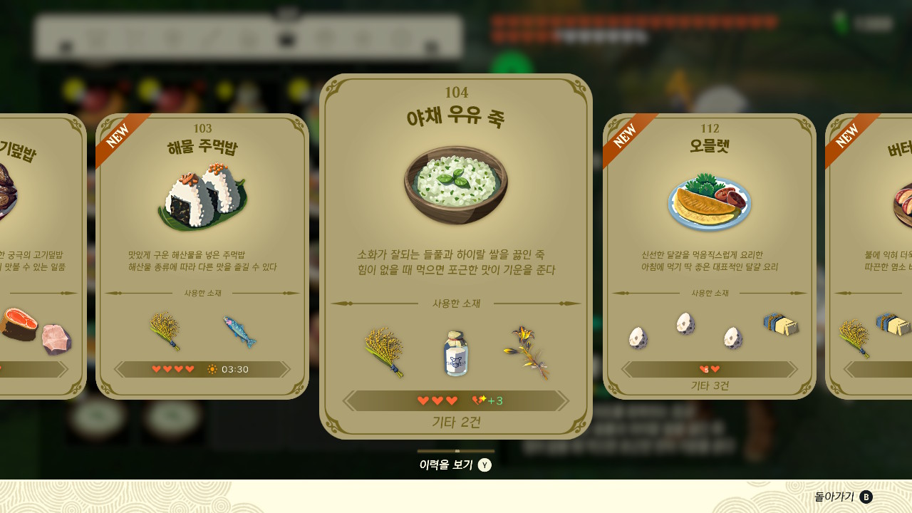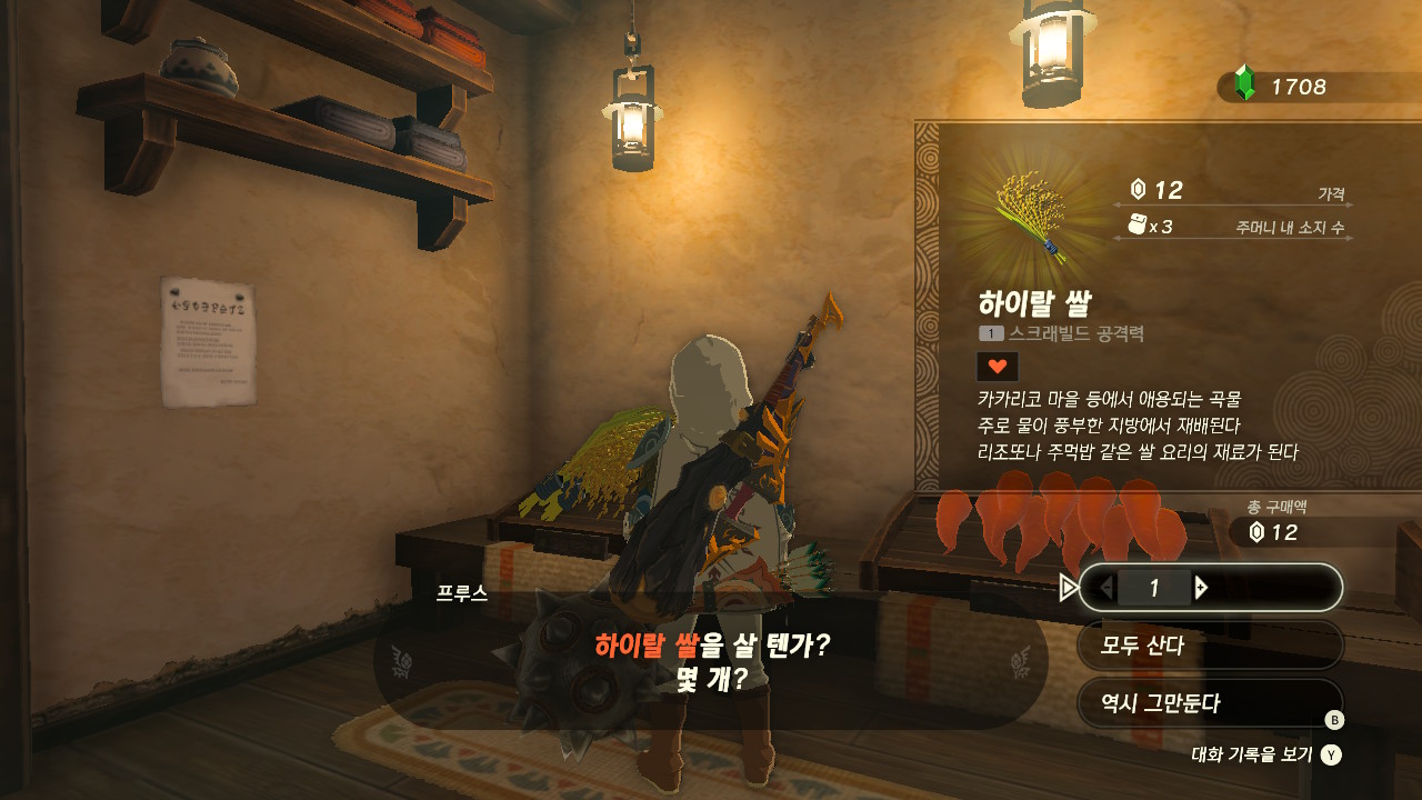 하이랄 쌀과 신선우유는 하테노 마을의 만물상 (추천) 혹은 카카리코 마을 서쪽의 이동 상인 레겐에게서 구매, 해품이꽃은 하늘섬에서 파밍하시면 됩니다.
