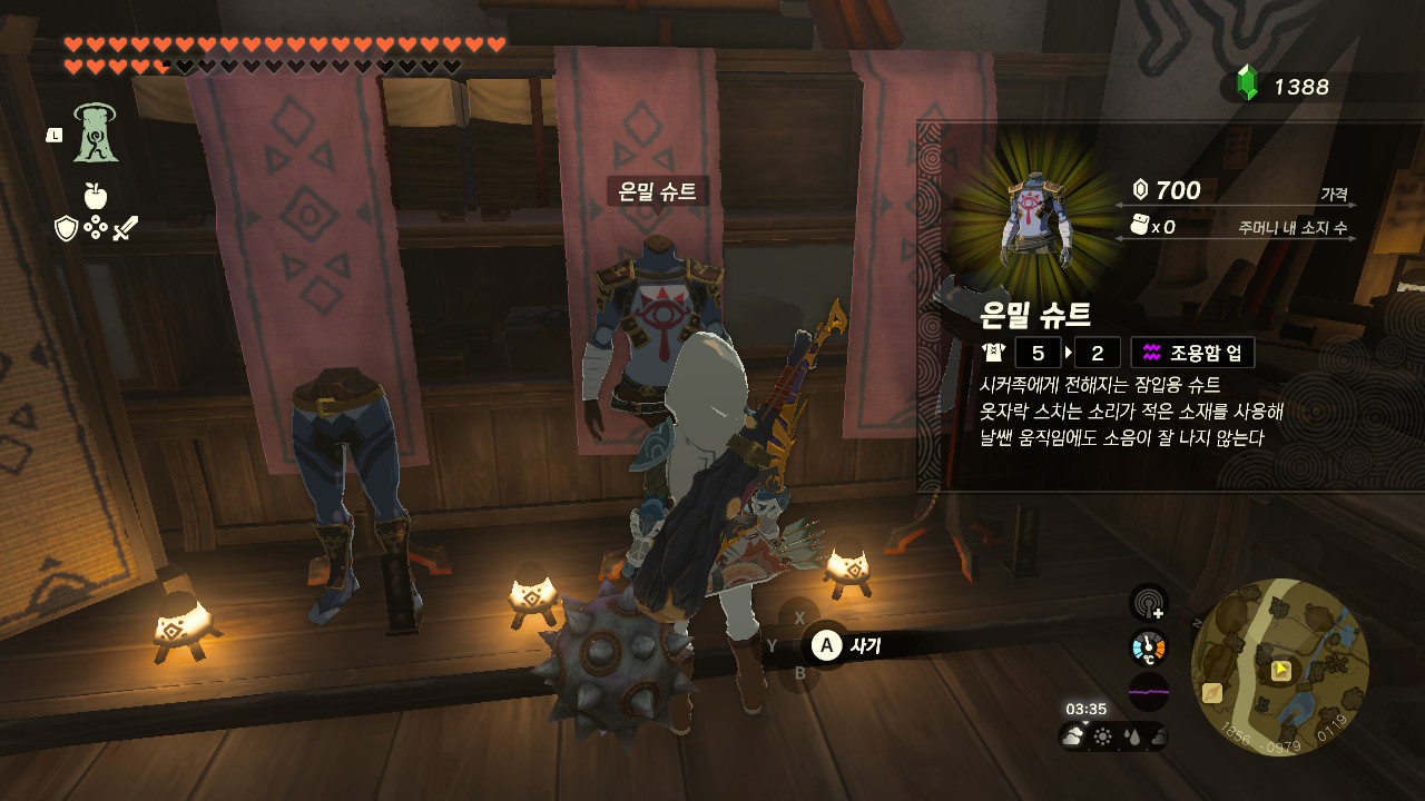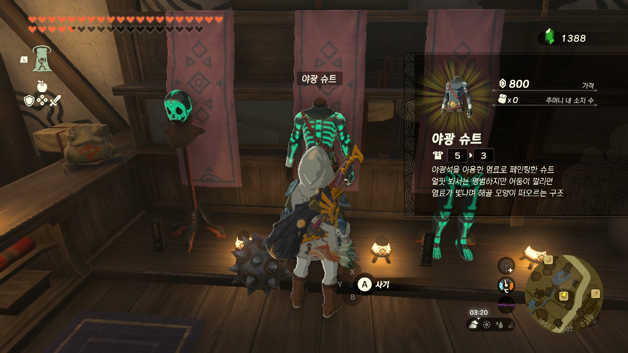 챌린지를 완료하고 나면 카카리코 마을 방어구점에서 파츠별로 5,000루피에 판매하던 은밀 세트와 야광 세트의 가격이 정상화됩니다. 만약 챌린지를 완료하기 전 5,000루피에 방어구를 구입했다면 NPC에게서 차액을 돌려받습니다.