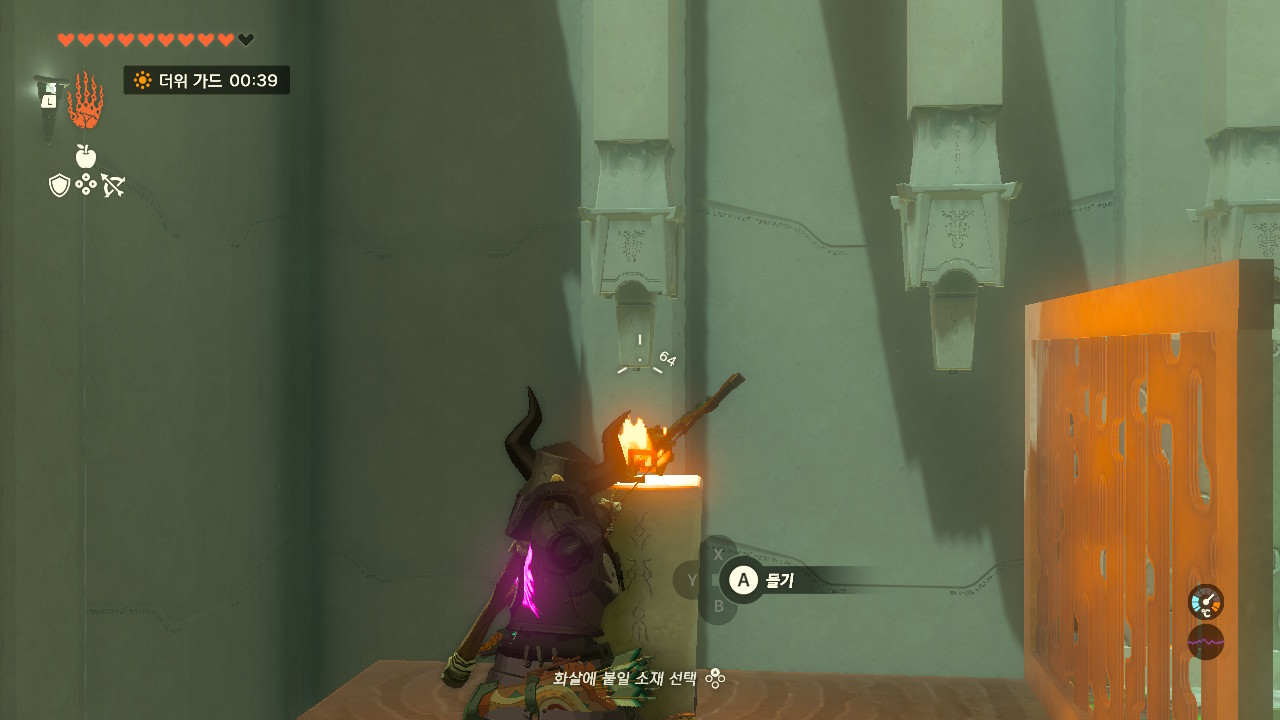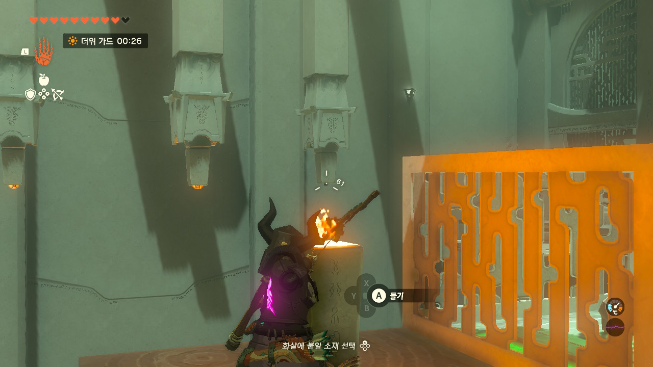 횃불을 손에 들고 불을 붙여준 후, 왼쪽에 보이는 돌출구에 무기를 던져줍니다.