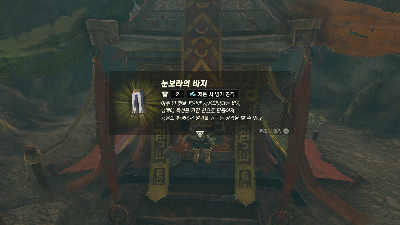 바로 앞에 신사가 있습니다. 눈보라의 바지를 획득합니다.