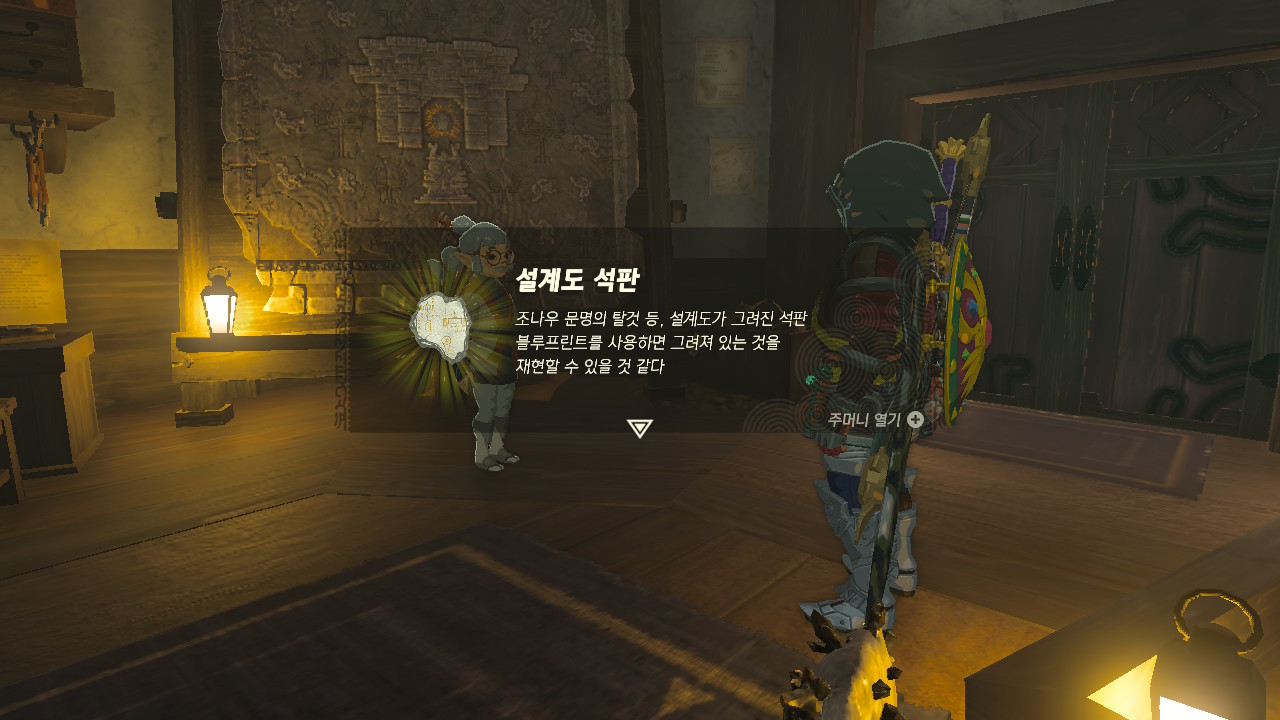 이후 다시 감시요새의 조슈아에게 말을 걸면, 설계도 석판을 주고 기구를 고쳐달라고 합니다.