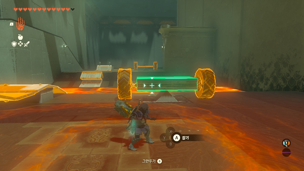앞에 보이는 장치 두개를 이어붙인 후 가동시켜 용암지대를 건너갑니다.