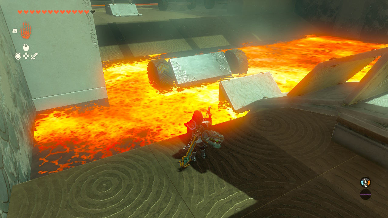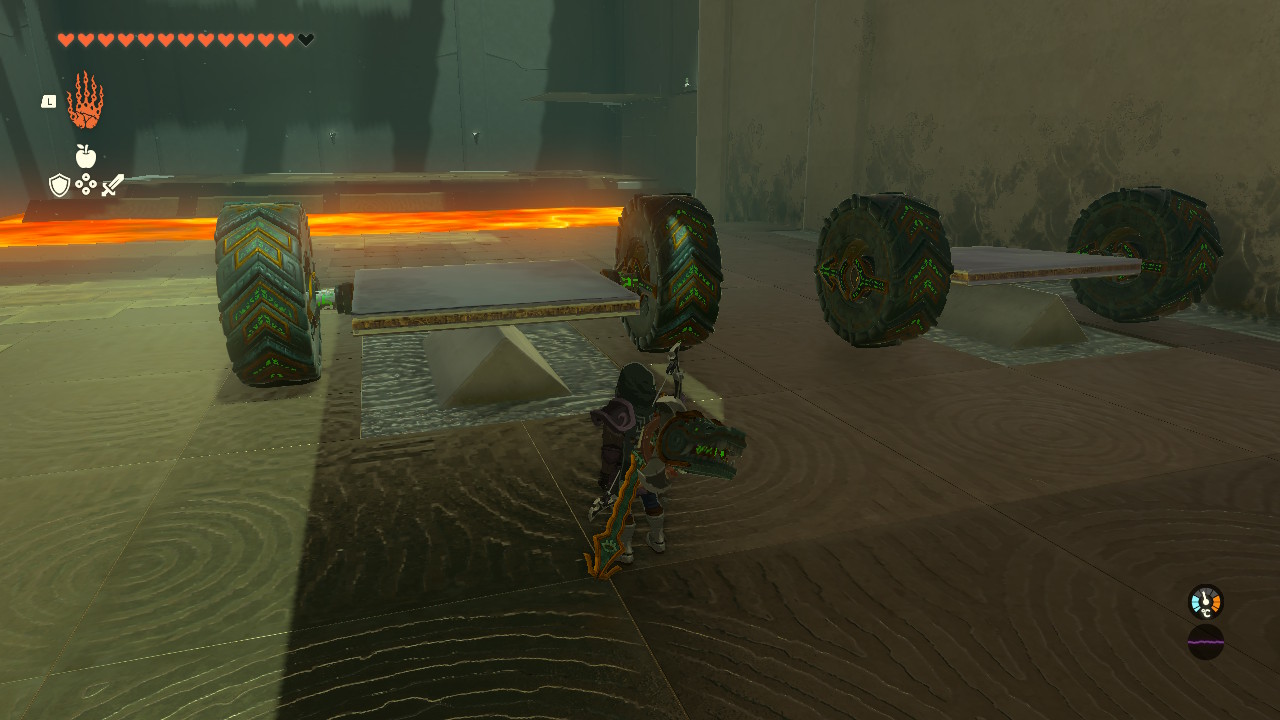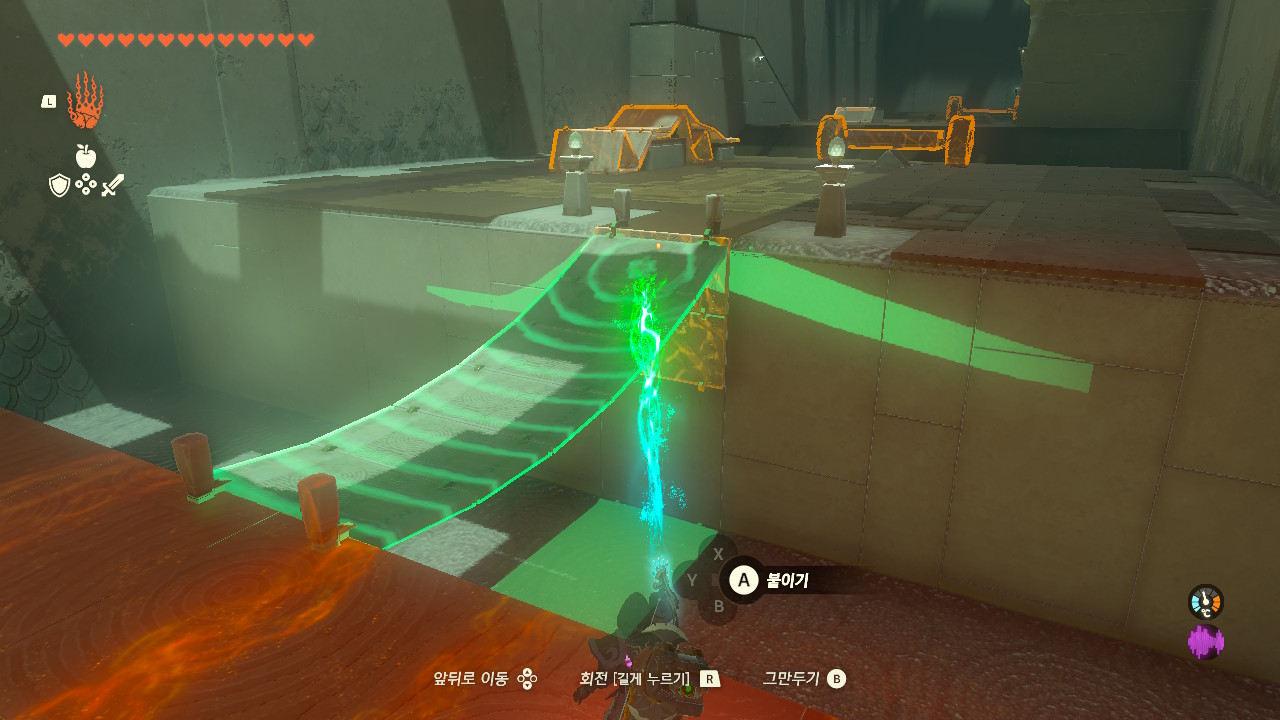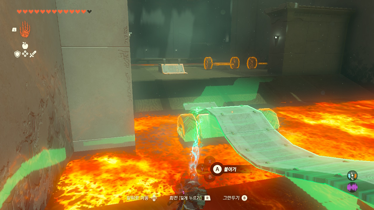 앞에 보이는 장치 두개를 이어붙인 후 가동시켜 용암지대를 건너갑니다.